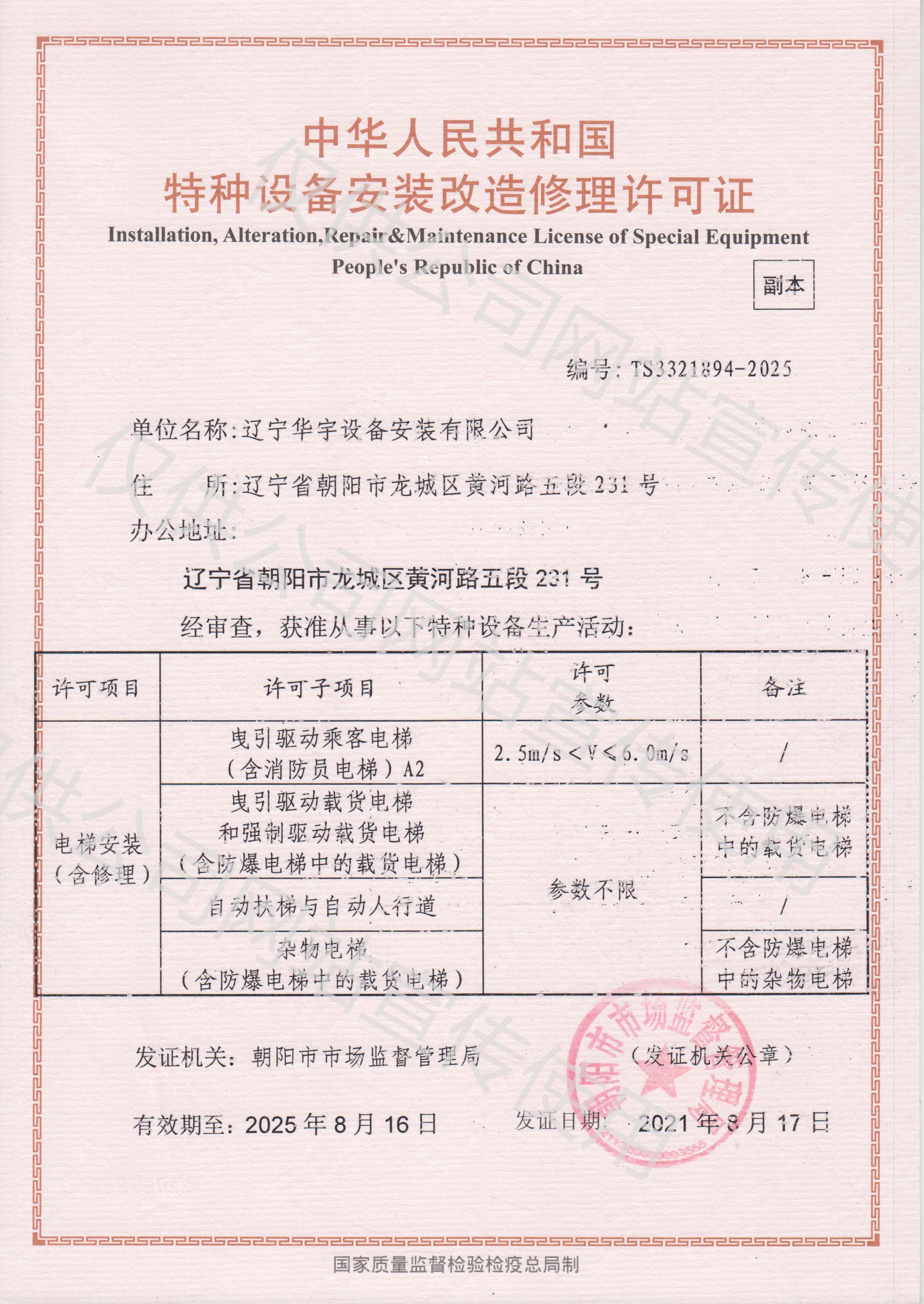 ? ? ? ?? 遼寧華宇設備安裝有限公司成立于2002年7月15日,注冊資金10000萬。公司占地面積60余畝,建筑面積4000余平。現取得消防設施工程專業承包一級資質、消防設施維護保養(yǎng)檢測一級資質、建筑機電安裝工程專業承包一級資質、電子與智能化專業承包二級、建筑裝修裝飾工程專業承包二級、安全技術防范設施設計施工二級資質、建筑工程施工總承包三級、電力工程施工總承包二級、輸變電工程專業承包二級資質、電力承裝、承修、承試三級資質、鋼結構工程專業承包三級資質和地基基礎工程專業承包三級。同時是人防工程通風(防化)設備生產安裝企業,并具備電梯銷售、電梯安
